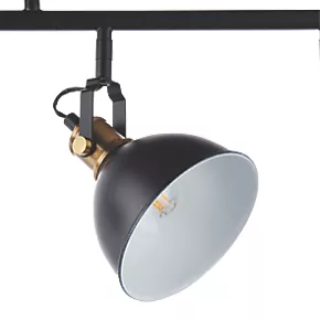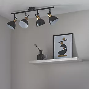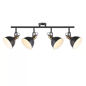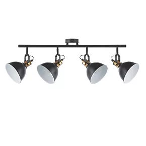 Industrial modern matt black and gold 4-light spotlight with adjustable heads. Metal shade provides directional task lighting. Compatible with LED lamps. Dimmable when fitted with dimmable bulbs.